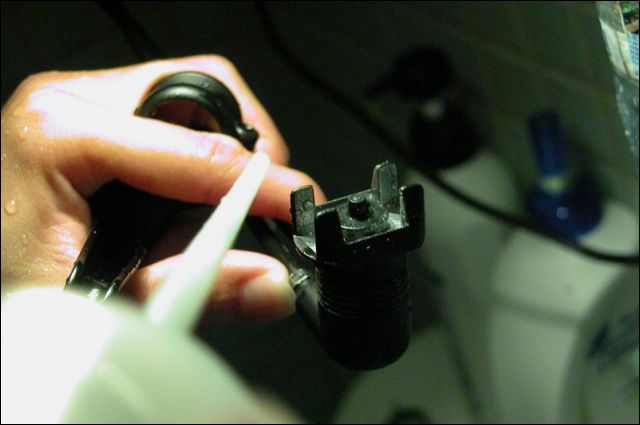 (卸下螺絲後鎖上這個, 並套上針筒上的管子, 以便灌水或油進去.)