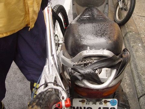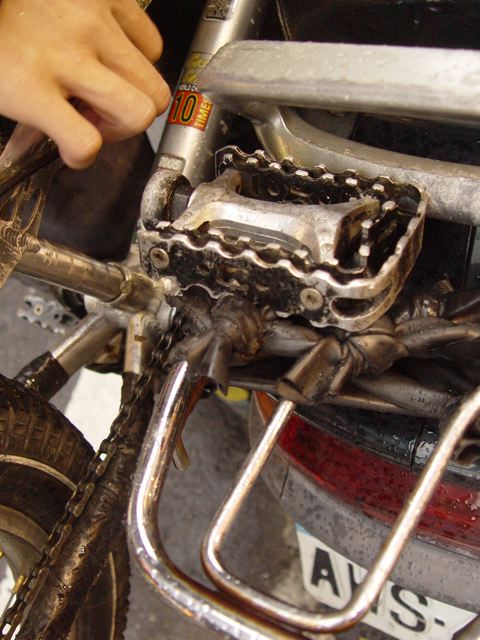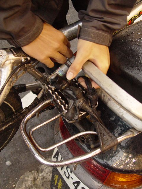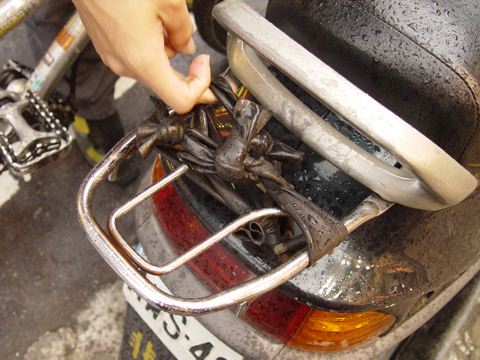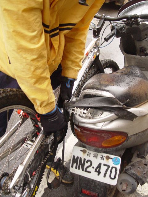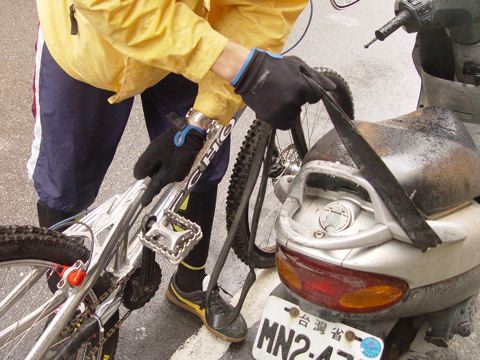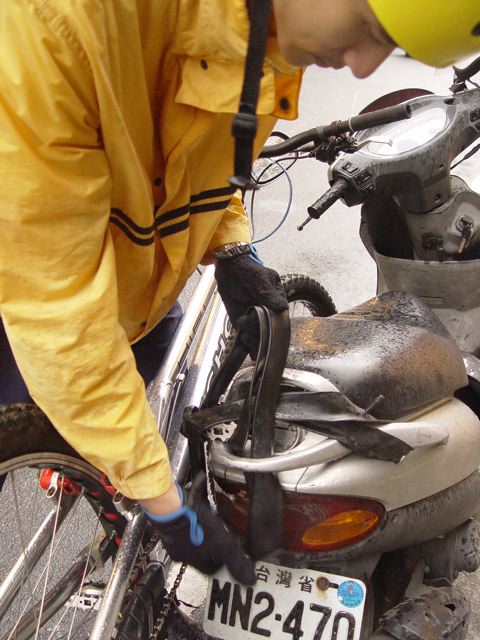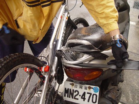 把兩道內胎交錯在踏板上,當然緊度要夠,但真的不需要緊到誇張,車沒有這麼容易掉下來