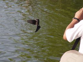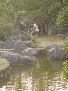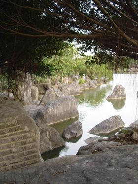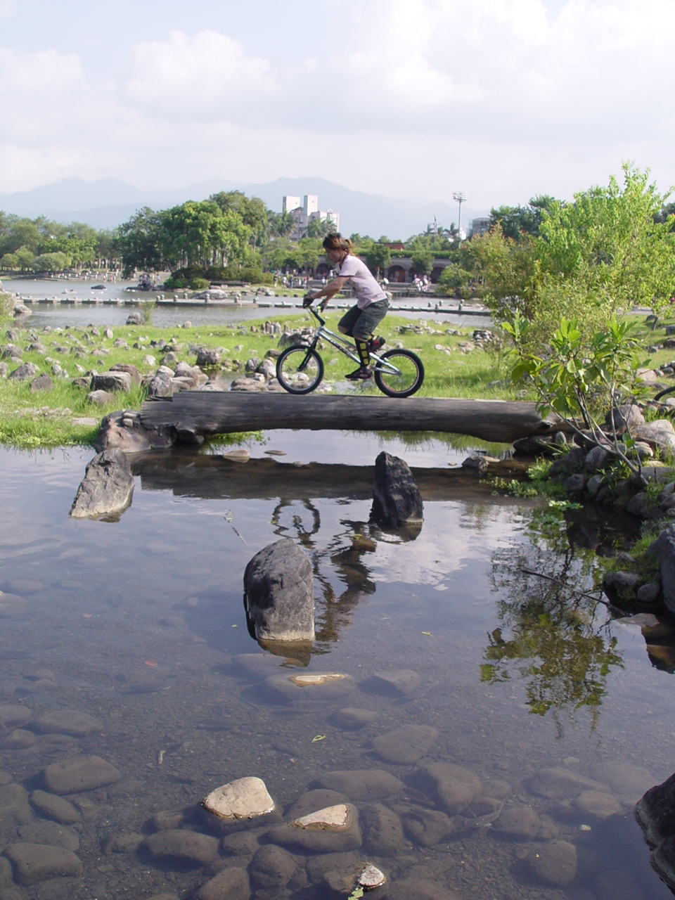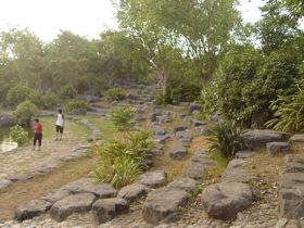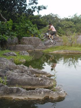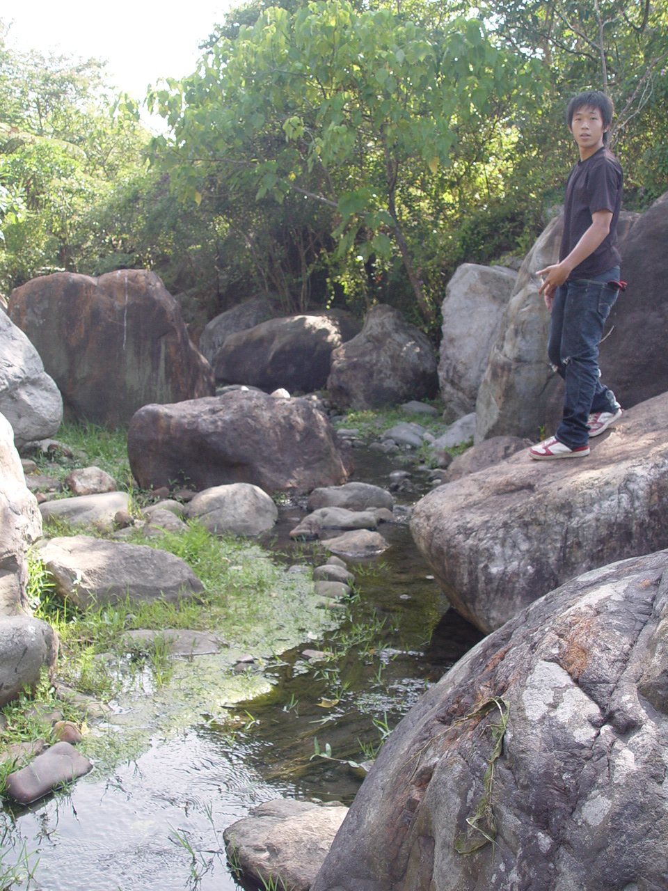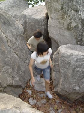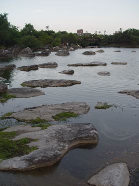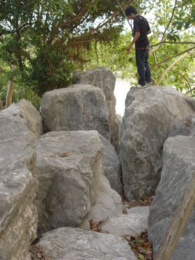 石頭堆裡面有一條路可以下到水面上,而水面上石點的距離都有點在跳遠理論值邊緣。