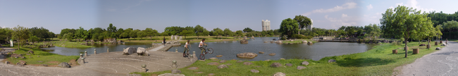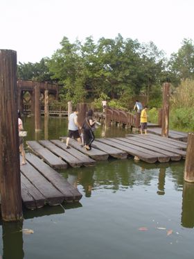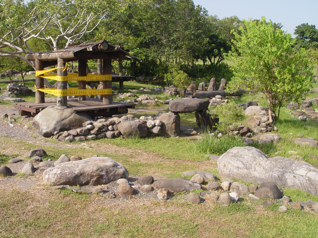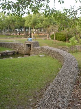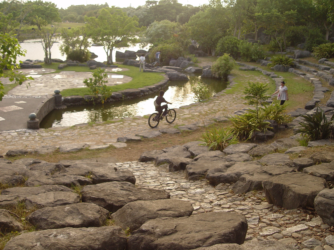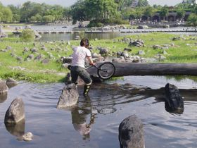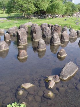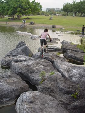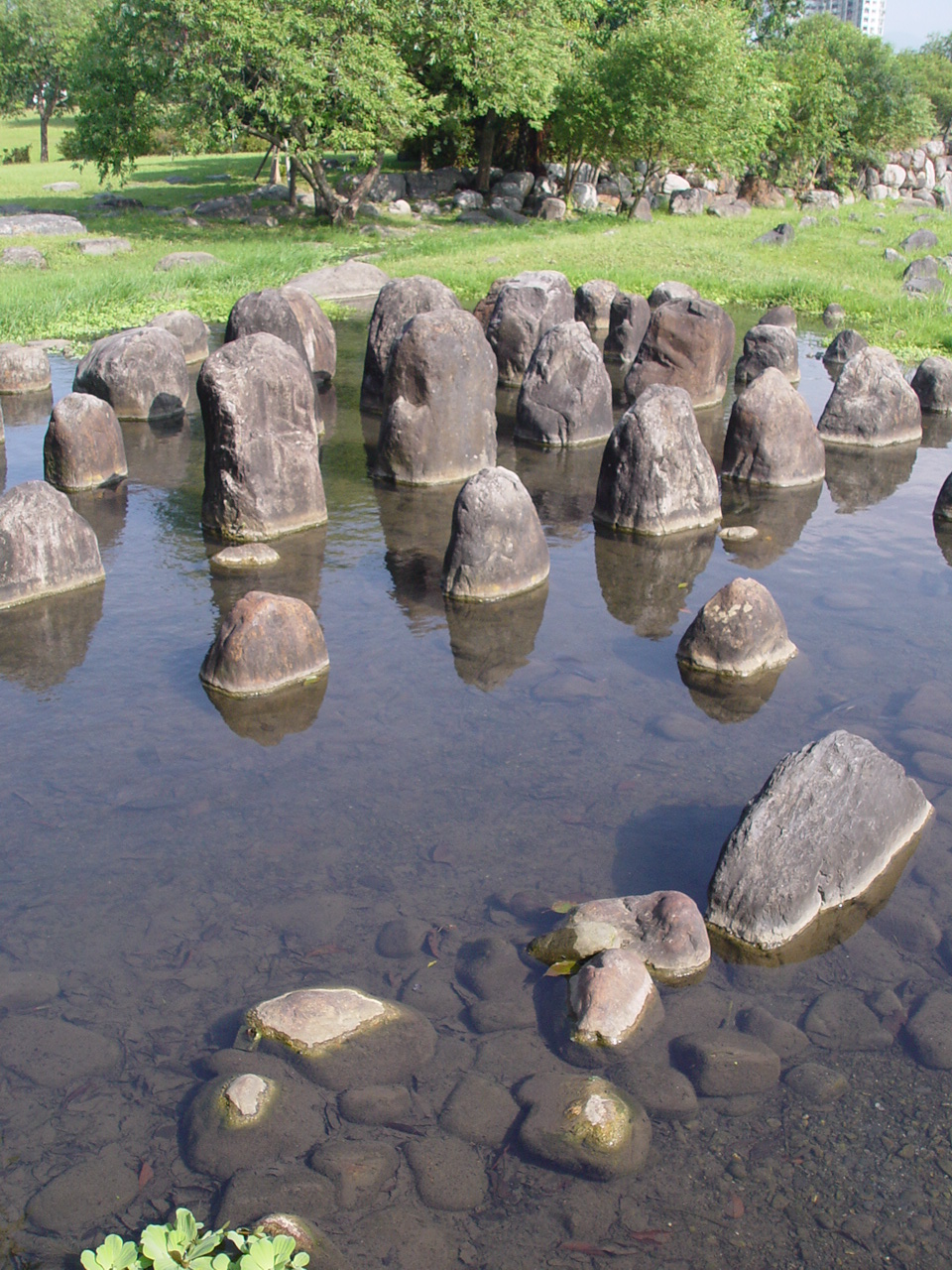 沿著湖邊順時針繞去會看到一區造景,主要地形是草地還有很淺的水混合雜亂的石頭。
