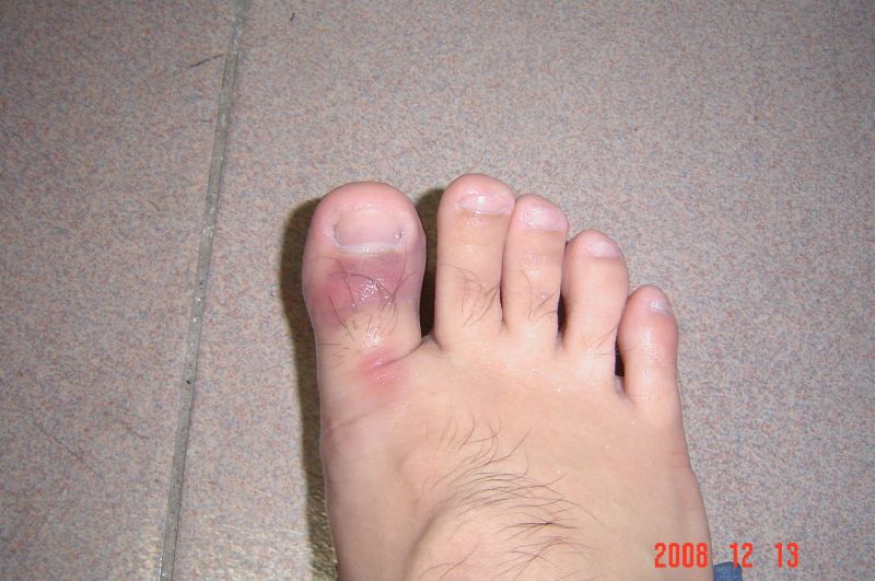 像小P這樣撞傷腳拇趾的狀況還沒聽說過, 真是天才, 建議小P以後騎車的時候在兩個腳拇指套上保險套以加強保護, 尺寸買最小的就可以.
