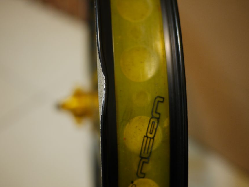 後輪有一點點凹掉的地方,不過敲一敲就大致可以回復原狀,參考看看...