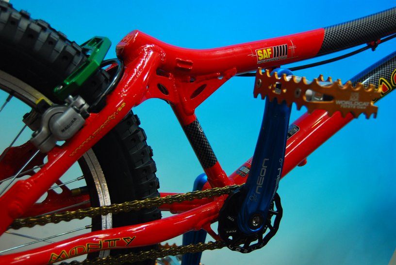 最近組了一台紅色MONTY 221PR, 車架買來時沒有防撞底板, 於是就用大車那種齒盤護框, 這樣重量應該也少了一些, 這種護框都是洞洞看起來就很不耐撞, 這樣的話騎車還要有所顧忌.