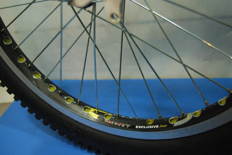 框的減重要弄很辛苦才會有一點點成效. 之前的VIZ框就讓我給打上了四個分別用5mm的鑽頭鑽出來的洞, 一個Spoke四週有四個洞, 一個框下來也有72個洞. 後來我又再將它們擴大到10mm的洞, 與原來5mm洞的重量差是35g. 大略估計, 這個框有了72個10mm的洞, 僅減了70g下來. 可是我未來要換760g的viz fork, 還要換上300~400g的前胎, 就比原來的重量至少少了200g!