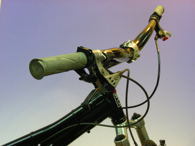 前叉用避震是比較不正統, 我的想法是目前若有前避震比較能避免收力不夠好時大落地的衝擊, 今天證明這想法還是有點道理的, 像我在平地上做踩踏跳練習時, 大車比小車容易跳得高, 結果就是跳得高跌得重, 以前落地時都震到快受不了, 有避震以後就沒問題, 避震前叉比較重, 玩前點跳行嗎? 今天練習到後來, 前點跳連續跳十下都OK啦!