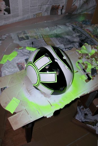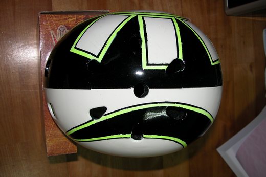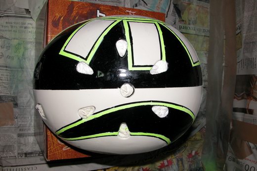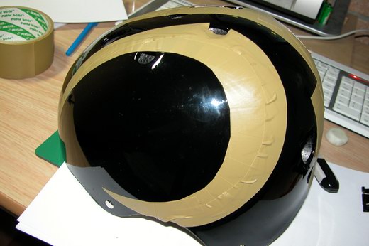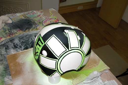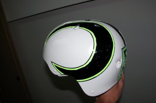終於完成我期待的安全帽了, 這個安全帽的樣式是來自於一法國車手 Vincent Hermance 的安全帽, 而此樣式最原始是來自一有名 GP 車手Rossi 05年安全帽的樣式, 一邊月亮一邊太陽...