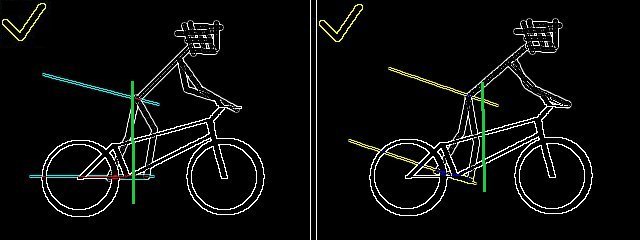 圖左是一個典型的錯誤,一般這樣的腳位會造成施力的不平衡,讓無法平衡的站在車上,就更別說定車能定得省力有效率;圖右是說明了人重心下壓的垂線其實不與地面水平,因此腳位的平衡不與地面水平反之與人施力垂線水平,如此才能平衡的站立在車子上。另外,Rocking定車時,可以透過後輪跳起的小空檔將踏板下踩來微調喔。