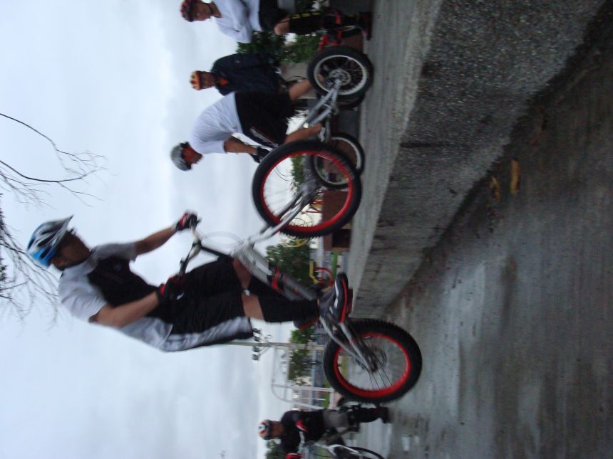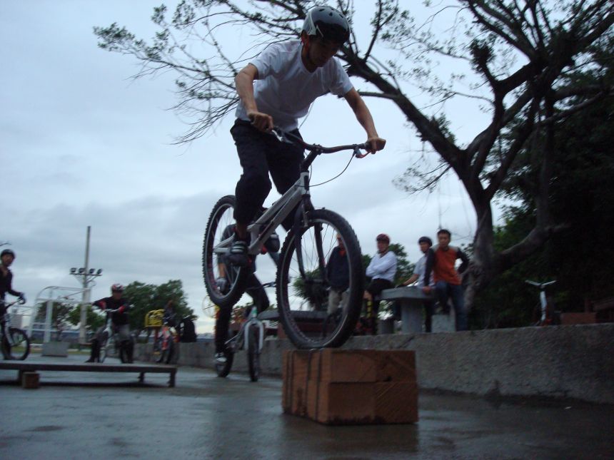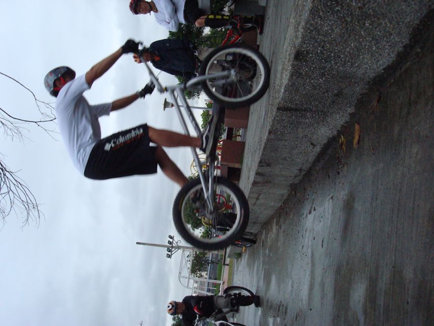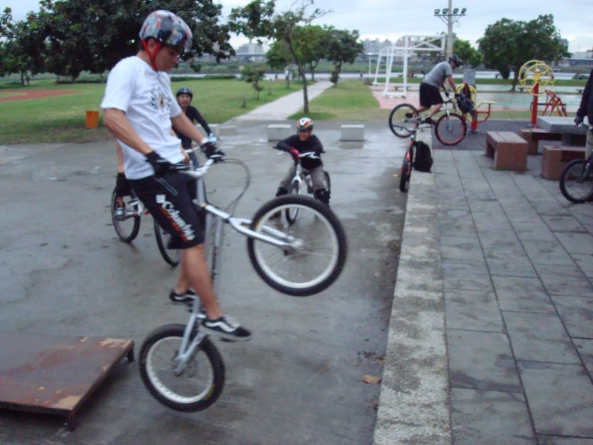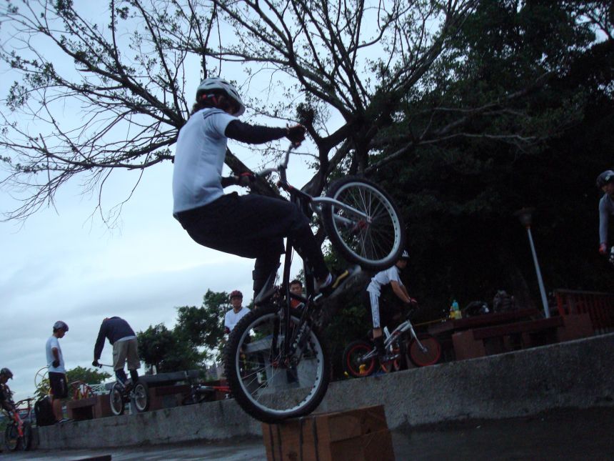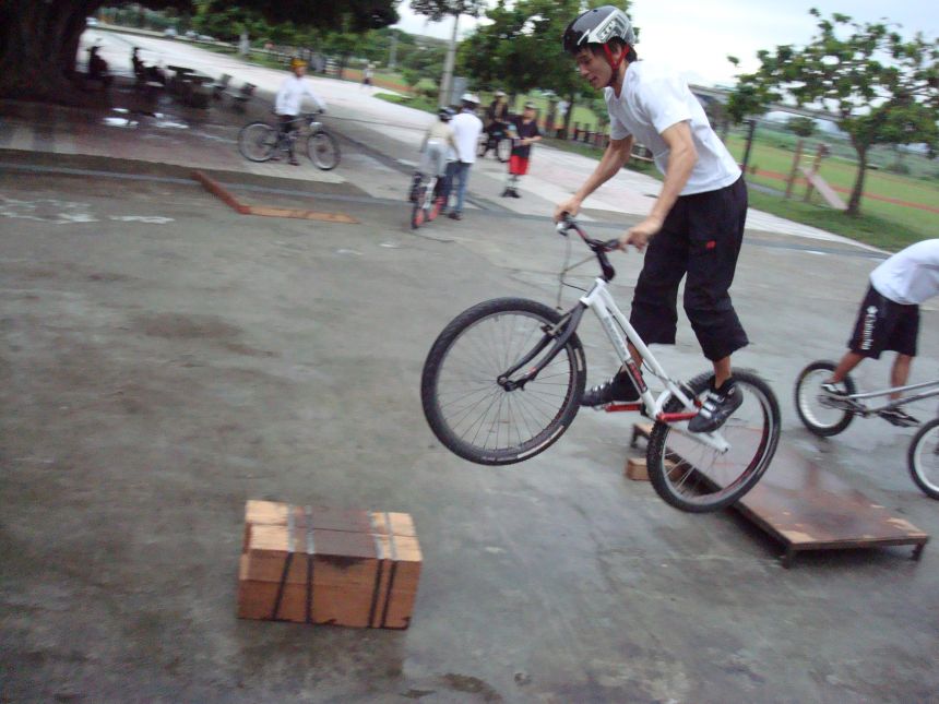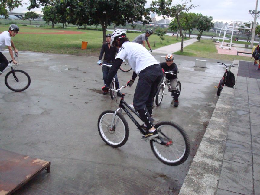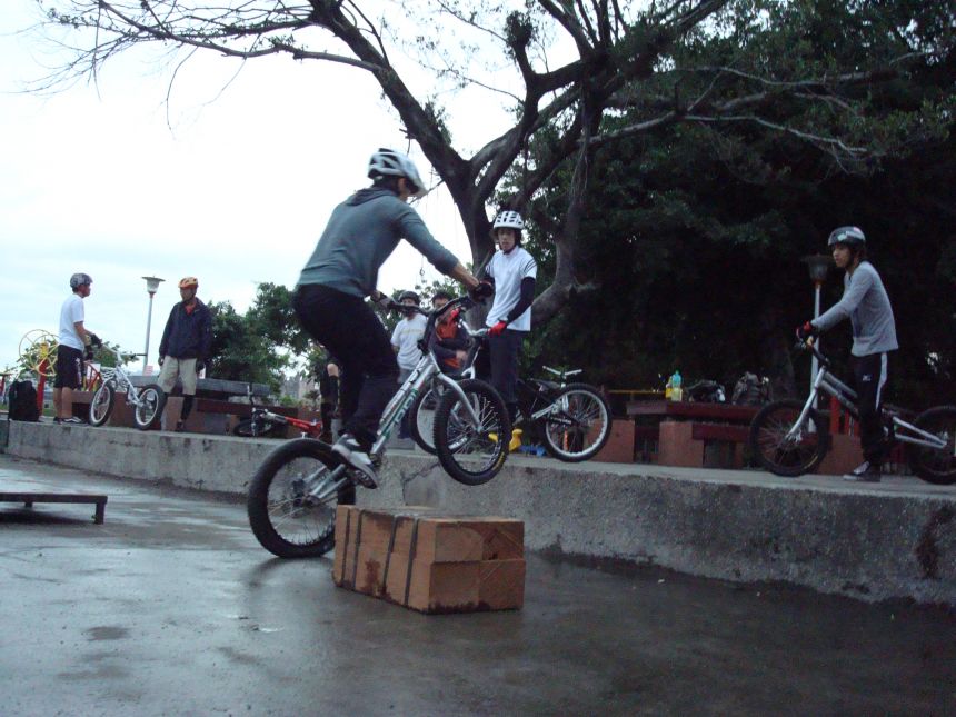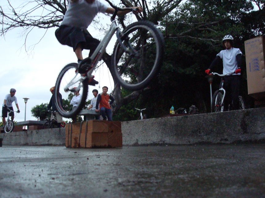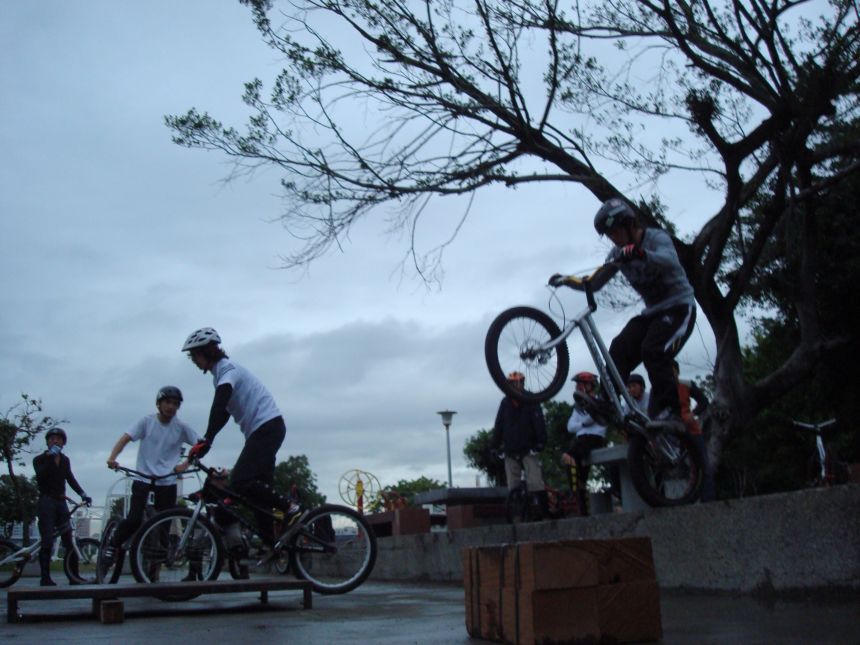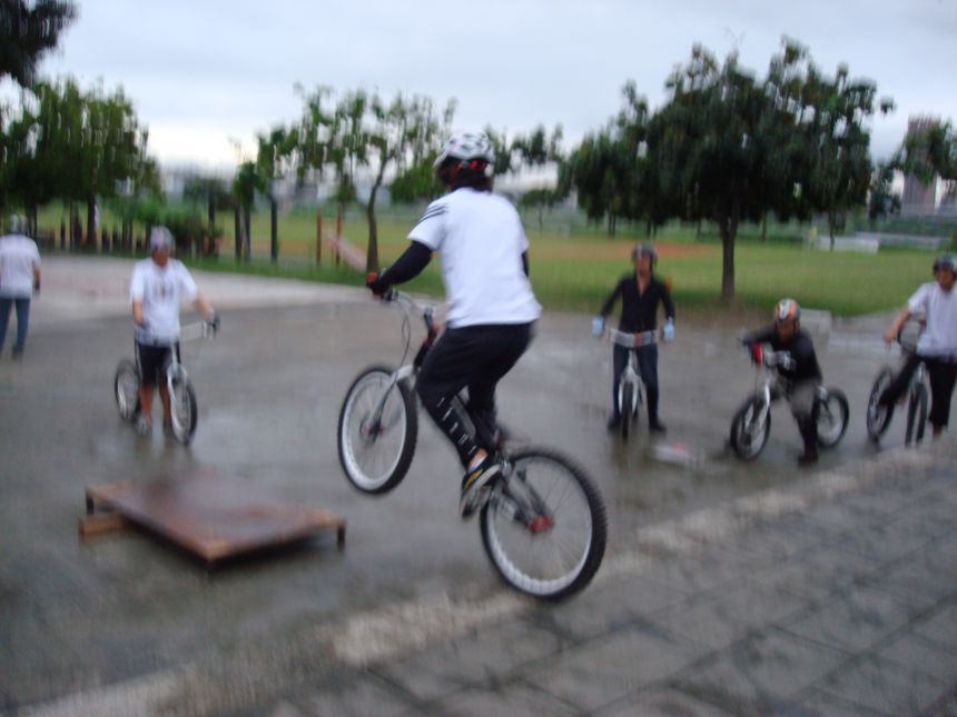 ㄚ涼在跳平台時腳滑了一下, 護腿的防寒布破一個大洞翻起來, 連底下的塑膠板都被打穿, 腳上只有一點紅紅的小破皮, ㄚ涼說光這一下那個護腿就夠本了, 下雨天狀況還是比較多, 好幾次都看到驚險的打滑場面, 幾個勇士們還是照常飛來飛去, 還有就是吸前輪已經成為相當普遍的技巧, 一堆車都不停的在吸.