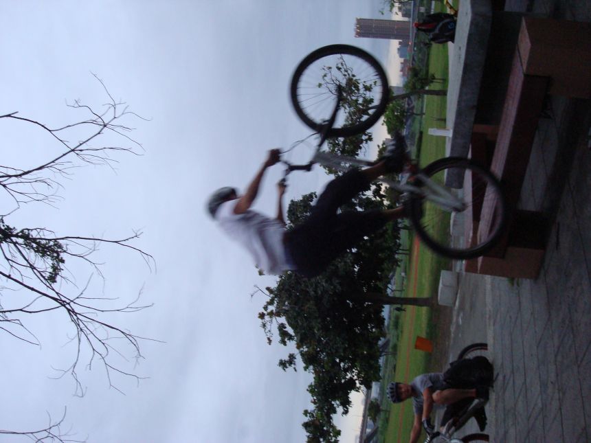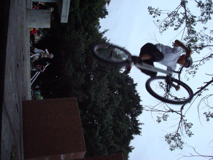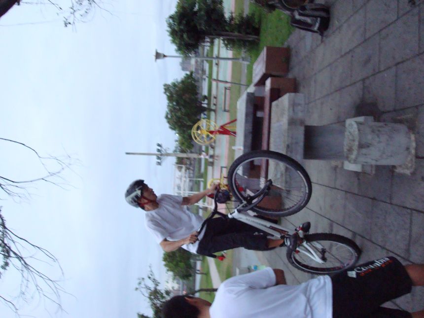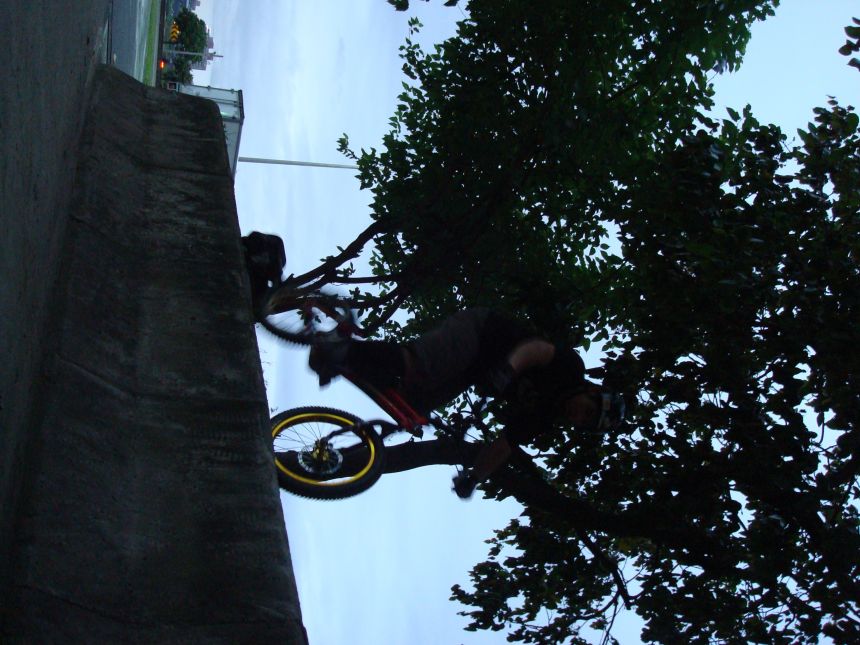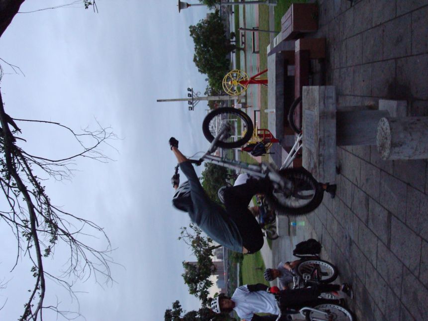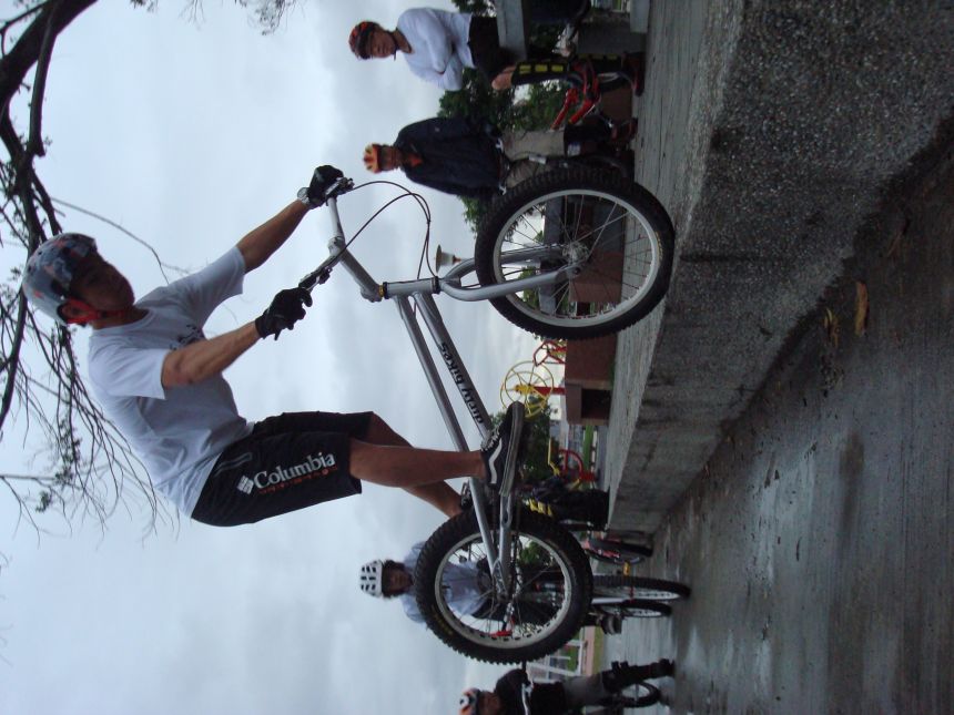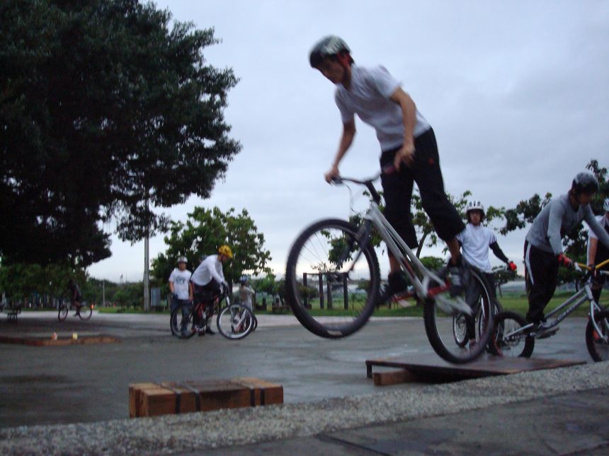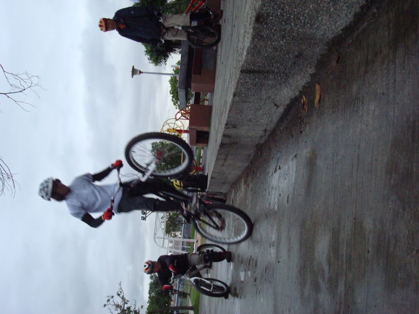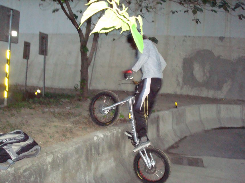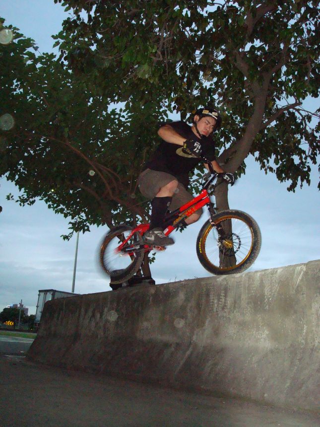 ㄚ涼在跳平台時腳滑了一下, 護腿的防寒布破一個大洞翻起來, 連底下的塑膠板都被打穿, 腳上只有一點紅紅的小破皮, ㄚ涼說光這一下那個護腿就夠本了, 下雨天狀況還是比較多, 好幾次都看到驚險的打滑場面, 幾個勇士們還是照常飛來飛去, 還有就是吸前輪已經成為相當普遍的技巧, 一堆車都不停的在吸.