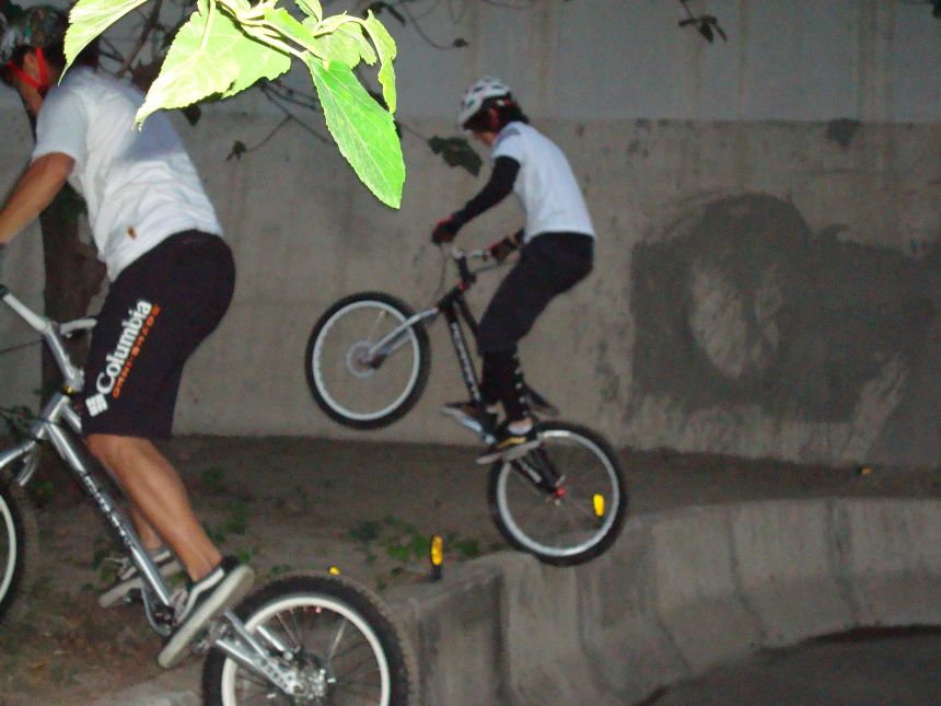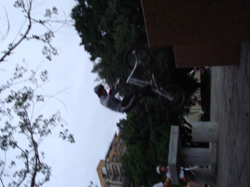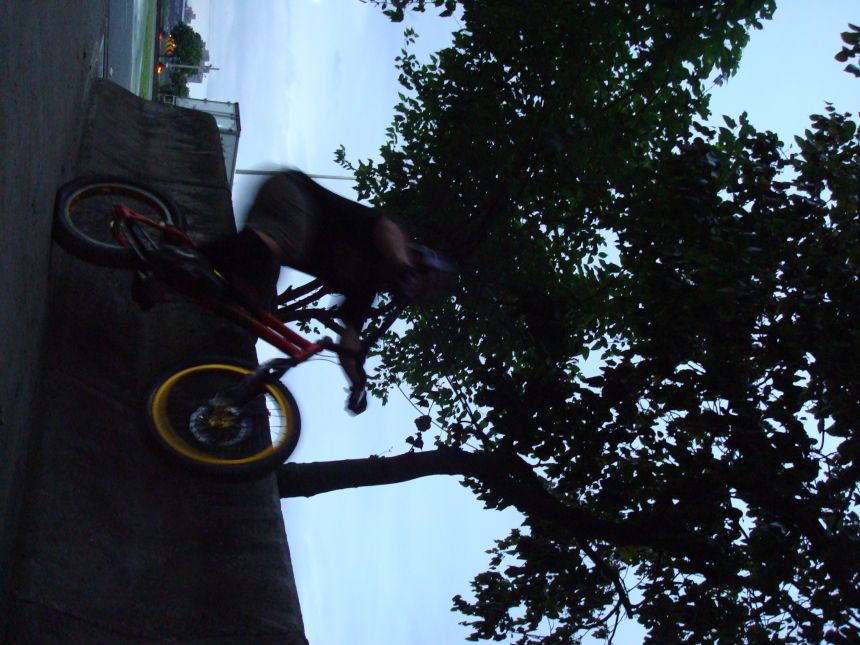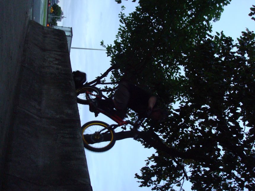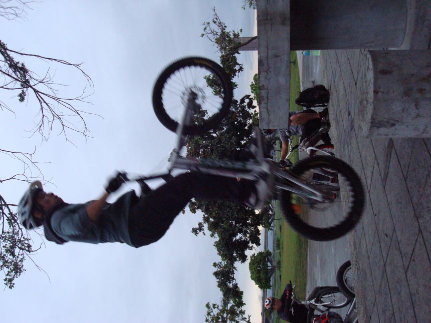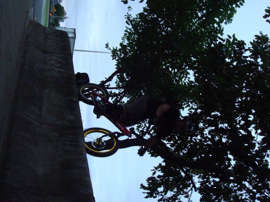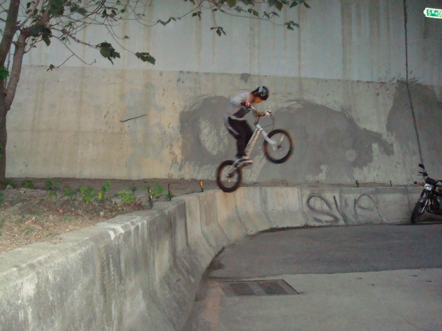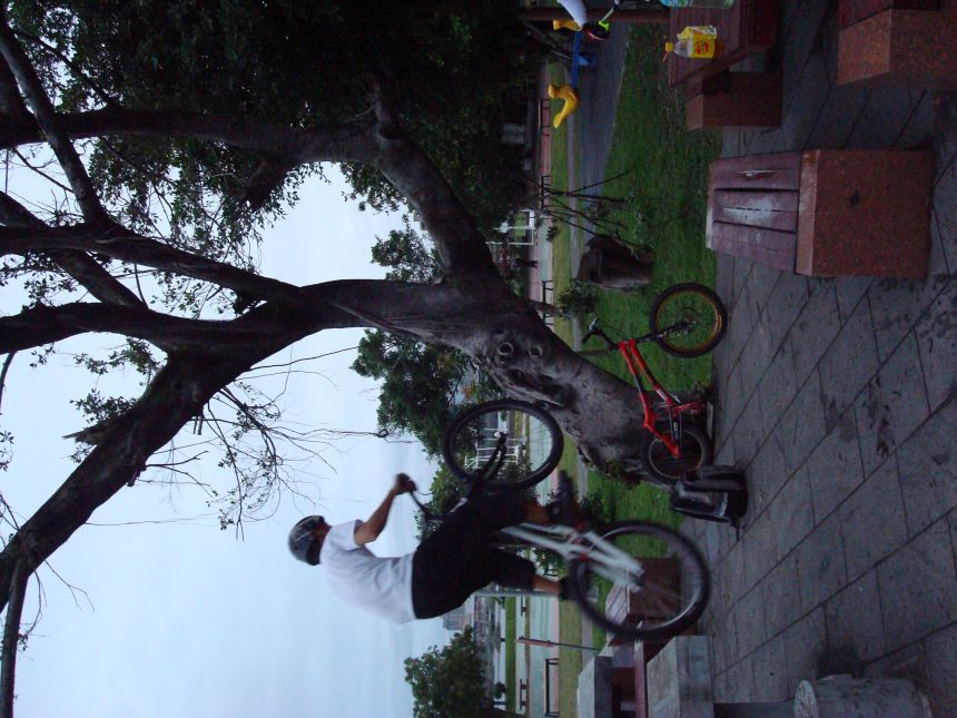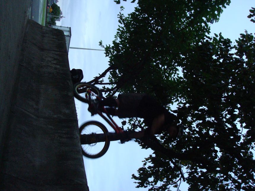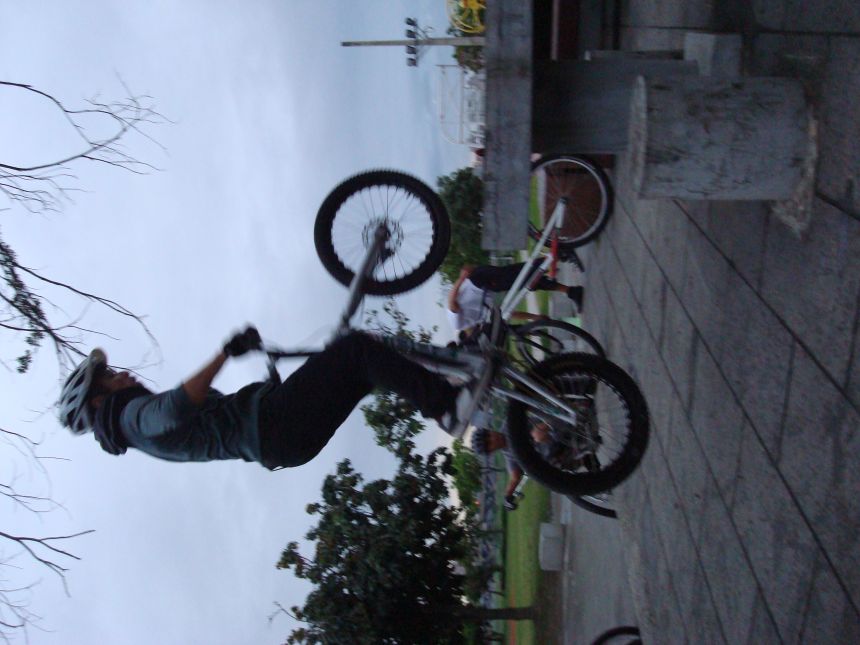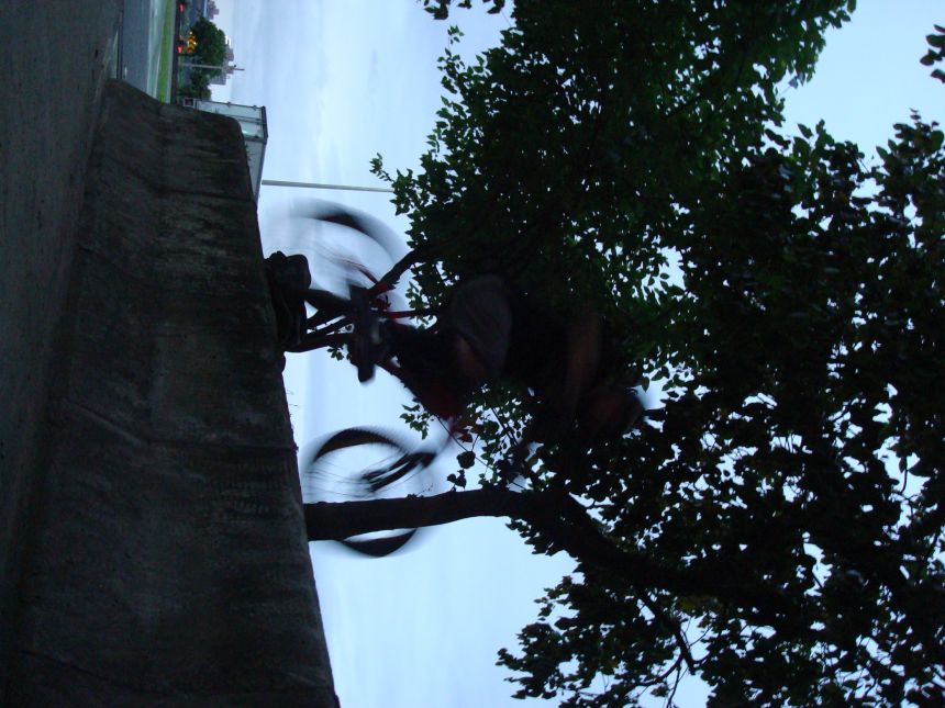 ㄚ涼在跳平台時腳滑了一下, 護腿的防寒布破一個大洞翻起來, 連底下的塑膠板都被打穿, 腳上只有一點紅紅的小破皮, ㄚ涼說光這一下那個護腿就夠本了, 下雨天狀況還是比較多, 好幾次都看到驚險的打滑場面, 幾個勇士們還是照常飛來飛去, 還有就是吸前輪已經成為相當普遍的技巧, 一堆車都不停的在吸.