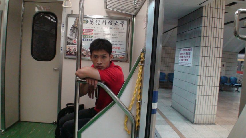 放在火車中間的欄竿,不過這邊比較擋路,回程時放的地方比較好。