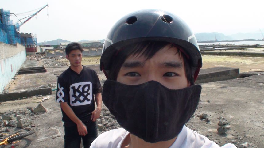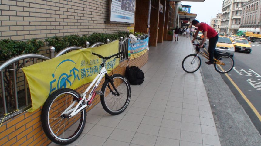 智偉難得沒有穿牛仔褲騎車.