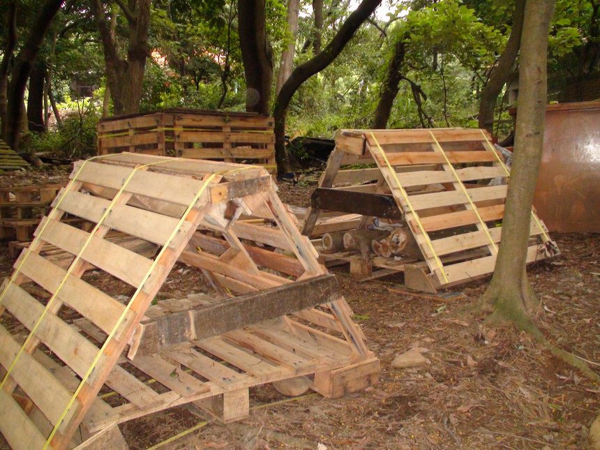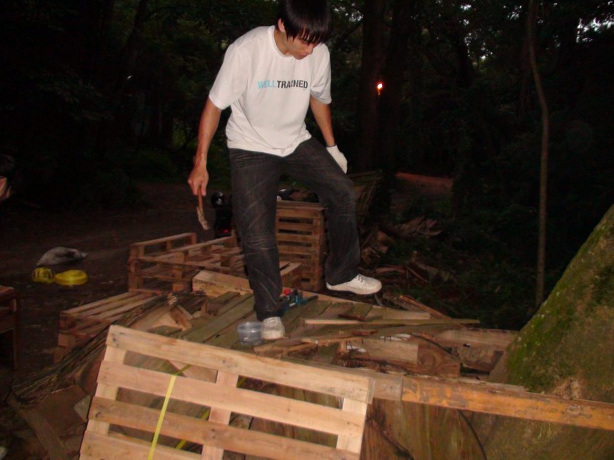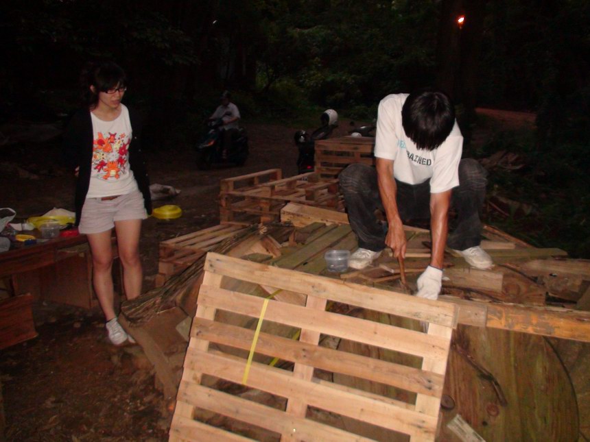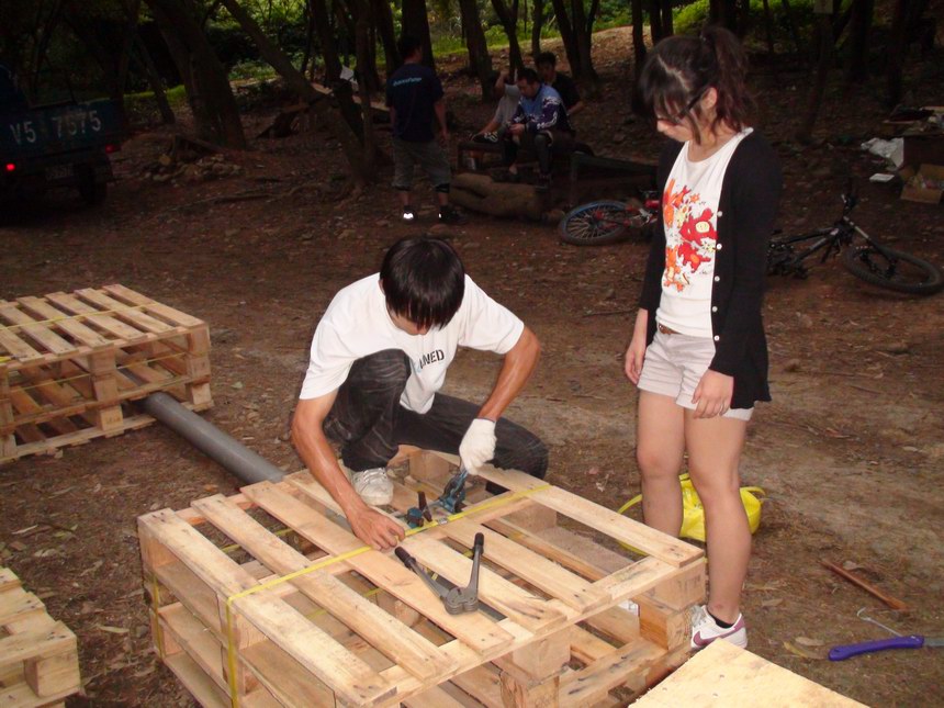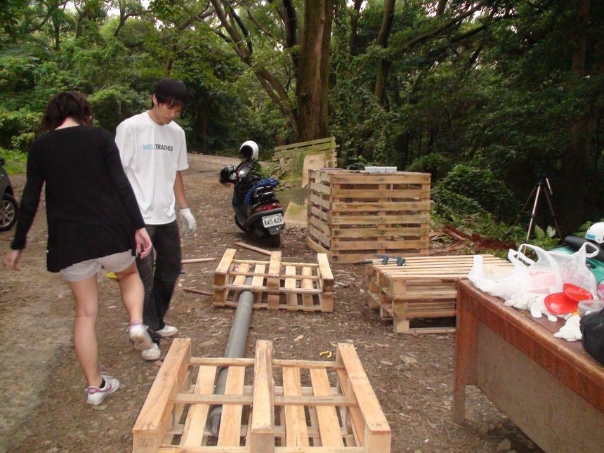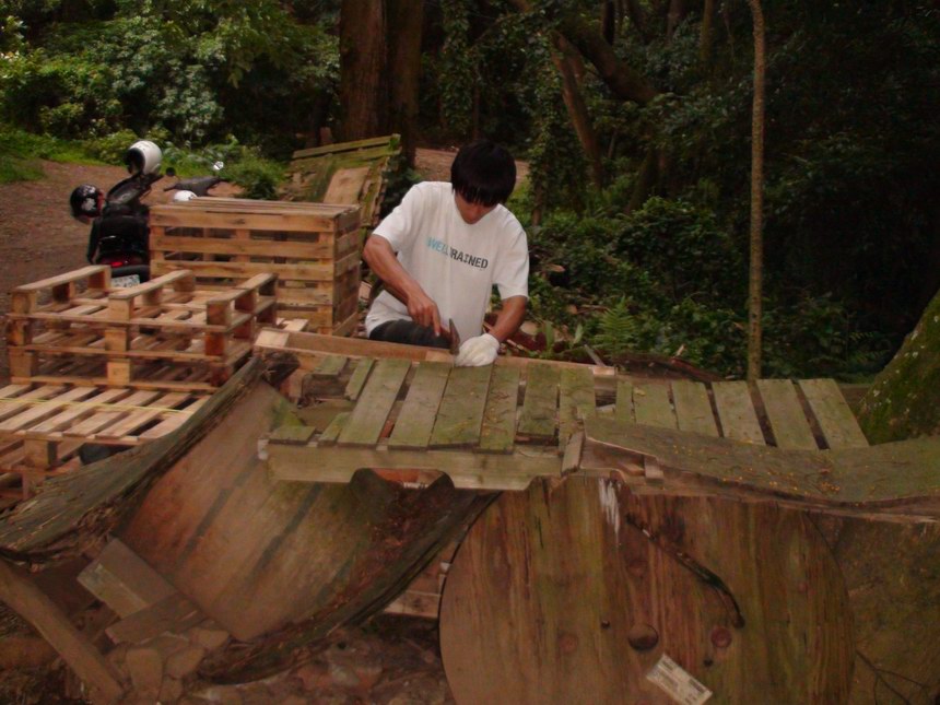 今天大家都沒辦法來,我只好找我女朋友來當我的小助手。雖然人手不足,今天帶著新購進的一堆大小SIZE的釘子,自信滿滿的釘好了一個超緊實的高平台和一個三層棧板台,並且修復了兩個存在的路線,最後俊傑拿來一水管又讓我們突發奇想弄個伸縮自如的水管細牆,哈哈哈!對對,呂教練那邊在我們沒去的這段時間,把一個最高的跳台和旁邊一個矮的,弄成讓我們攀岩車可以騎上的路線地型,所以是個大收穫,非常感謝他啦!