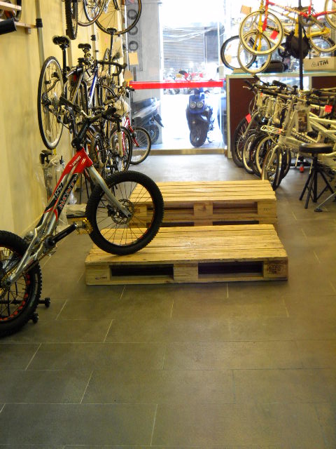 店裡來了一個外國人, 我本來當他是一般逛街的客人跟他點個頭以後繼續我的工作, 客人進來通常不用緊跟著, 除非他主動提出問題, 不然有些人還是喜歡沒有壓力隨意看看, 不過這個老外走到我的店的後半攀岩車區以後就盯著兩台黃金攀岩車看了很久, 於是我就跟他說那是 trial bike, 結果他本來就知道那是trial bike, 還說在美國那邊他家有兩個少年在玩攀攀, 他在網路上看過我的店特地來瞧瞧, 顯然他有上BTT看過.