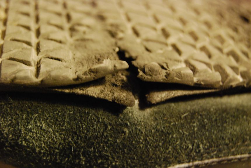 仔細檢視了一下我的世界貓車鞋, 用了兩年多的鞋子已經磨出一道深溝, 問題是凹槽的兩邊也都開了, 原來它就是腳會滑掉的元兇, 世界貓踏板的共犯.
