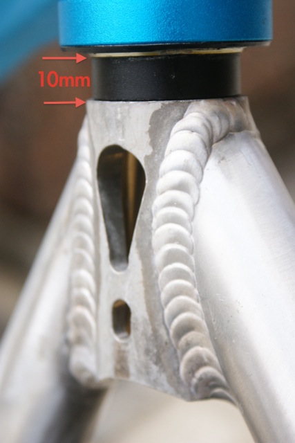 當你先買車架(他牌),她有本來應該配的前叉長度...例如,MONTY 221 Kamel必須配384的前叉並且他是半隱藏式頭碗,這時候問題就來囉!!市面上沒有制式規格的前叉...這時候用貓叉加墊圈就搞定了,沒加以前!!車根本不能騎,因為太""趴""了。