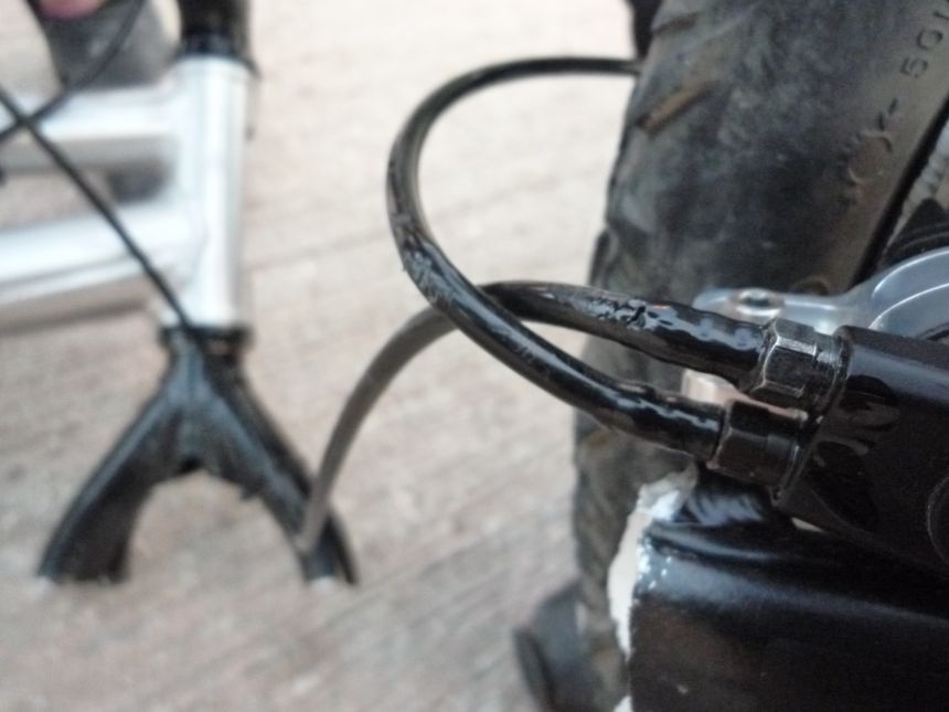 不過Hs33版本的前叉,在煞車座的位置上確實會因為煞車的推力,再外加對前叉的外力,讓該處的受力達到一個極限。