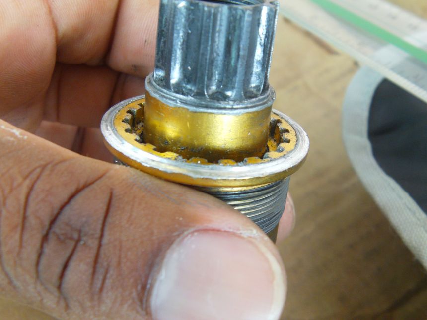大黑的BB可能再也無法鎖緊曲柄了;除非換spacer,軸心上金黃色的已經變型那一段。不然接下來如果只換薄的護盤,短時間內即使鎖緊曲柄因為沒有那spacer來頂住曲柄,大概撐不了多久會再鬆掉!!然後曲柄ISIS牙跟著壞掉,越花越大條!!!