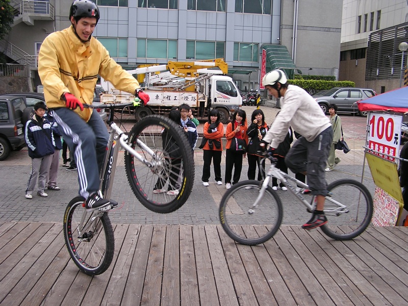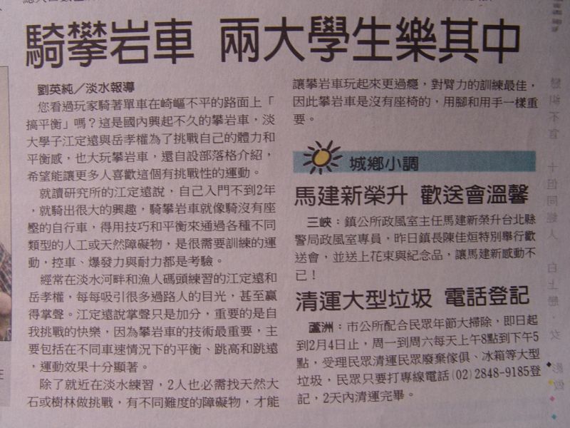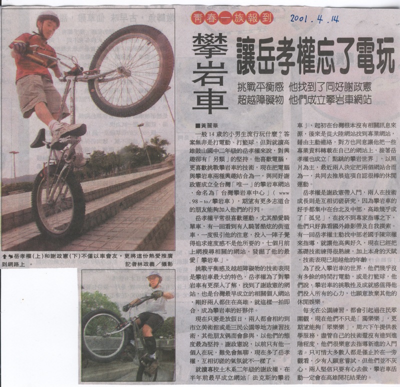 您看過玩家騎著單車在崎嶇不平的路面上「搞平衡」嗎?這是國內興起不久的攀岩車,淡大學子江定遠與岳孝權為了挑戰自己的體力和平衡感,也大玩攀岩車,還自設部落格介紹,希望能讓更多人喜歡這個有挑戰性的運動。