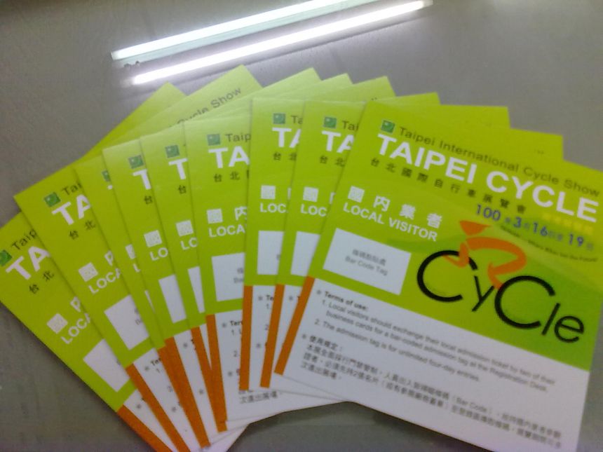 這幾天我都在車展會場從事會場裝潢!據我經驗想要入場參觀有兩個方法?壹:就是最後一天買票進入!我要說的是第貳個方法:車展期要入場的人須備有兩張名片!但須是從事自行車相關行業如如(車行)(零件商)(修車業)(自行車推銷員)須到現場服務台填寫個資交換入場證! ps:想辦法去跟他人要兩張名片吧!