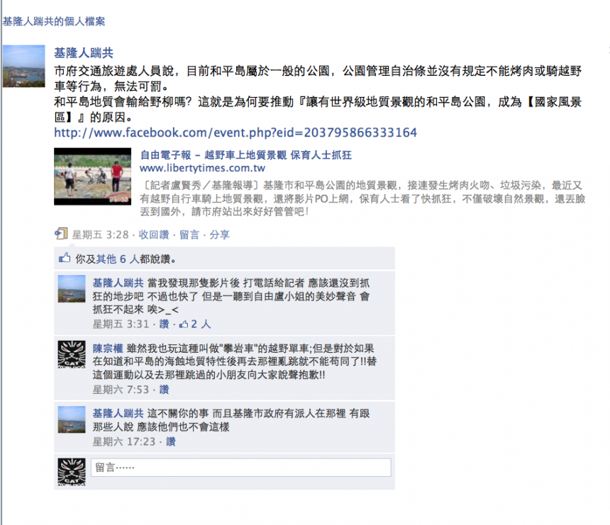 可是紅了和平島卻黑了攀岩車,連個正名的機會都沒有!!只被歸為""越野車""付出這樣的代價可惜了!!在基隆人踹共的FB留言也沒被不好的對待或者是攻擊;可見那邊的人並非好事的人或團體!!只是基於愛好自己鄉土的立場而指責。另外相信去那裡騎車的人也不是惡意破壞...只是沒經過好好溝通解釋的情況下總被""誤解""騎車是不好的行為!!!這對攀岩車愛好者是不公平的,甚至失去一次攀岩車運動好的一面被不騎攀岩車的社會大眾認識的機會...