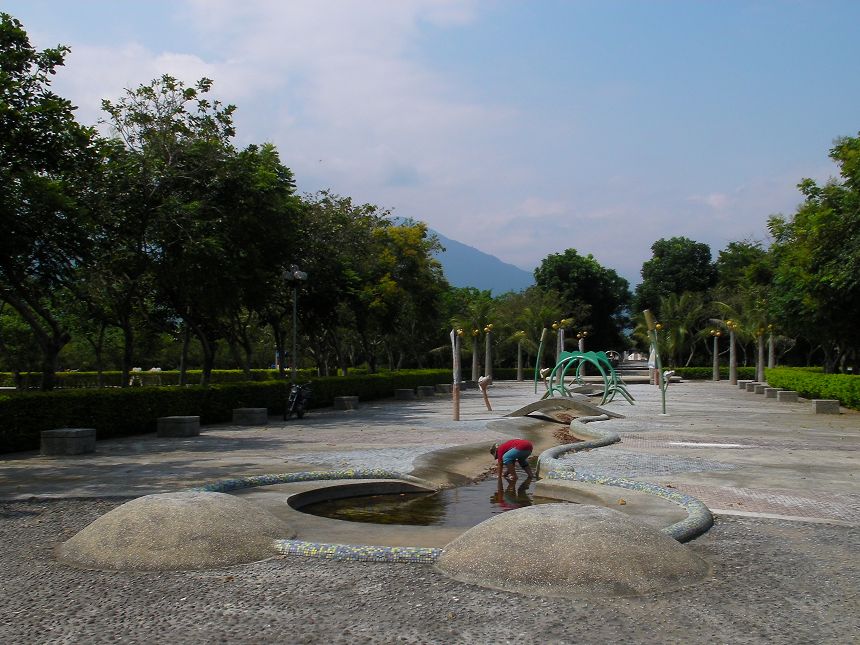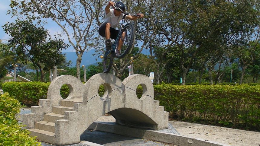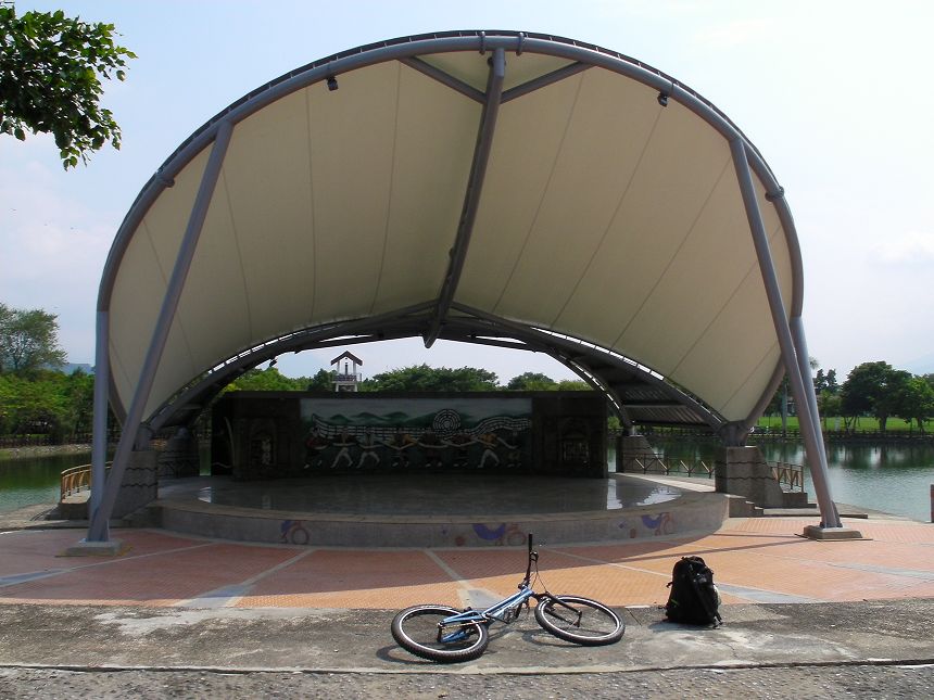 這公園裡面有給平路腳踏車騎的,也有給小孩玩水的地方,玩過冬山河親水公園,我當然對只要有親水兩個字的公園都抱有期待,但是,這個親水公園就實在是有點無聊,看到照片中這些無敵低落的台階和矮橋,真是毫無可以騎的地方。雖然這公園剛好逢維修整理的日子,沒有什麼人,但後來還是被清理的人趕走了,害我只能到平地腳踏車騎的地方看看有沒有可以好玩的東西可以跳。