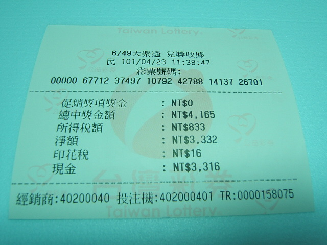 你中的400元算起來比我中過的1000元還要多, 因為我平均每期買一張, 數十年只中過一次1000元及其他幾次數百元的, 目前還在等著老天眷顧我.....