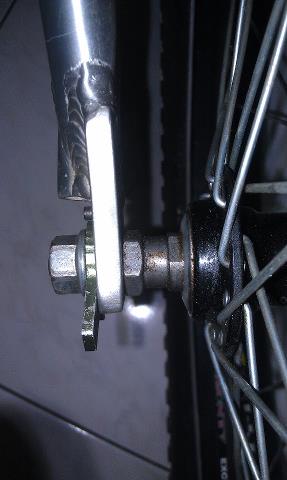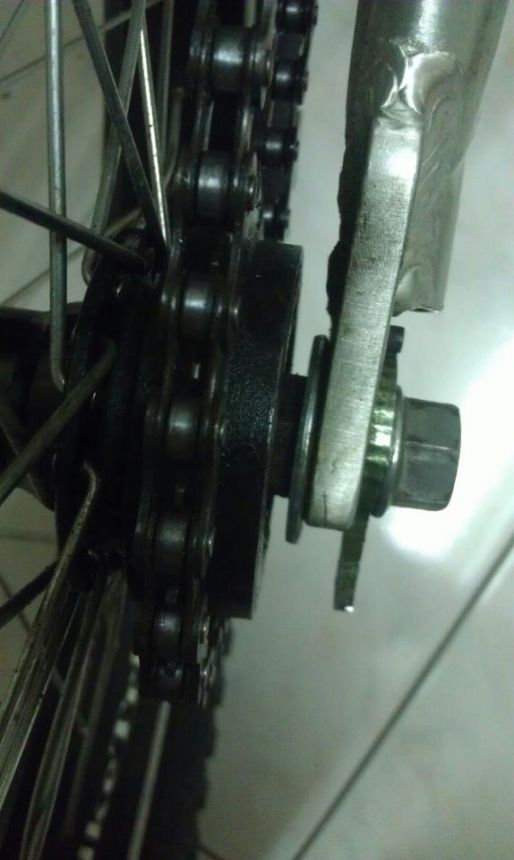 Monty 219 原車賣出來的時候沒有調整鏈條緊度的裝置, 只有外面那個大螺帽及螺帽下的墊片, 當裝上稱為蝸牛片的拉鏈器的時候, 就將墊片取下不用, 也就是目前飛輪那一邊的車架內側那個墊片是多餘的.