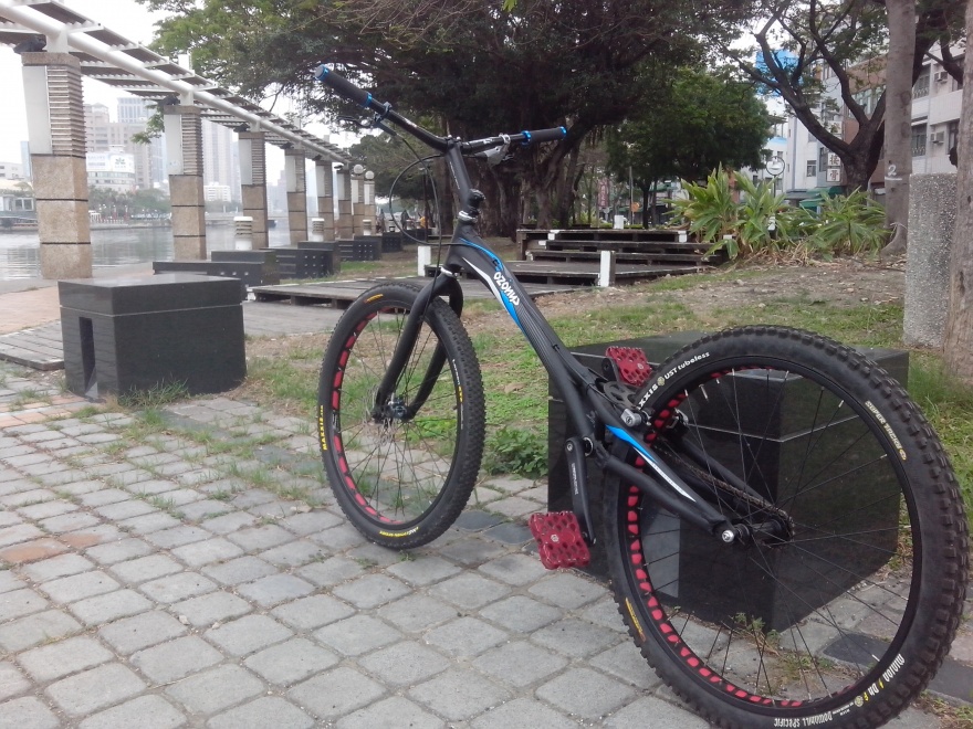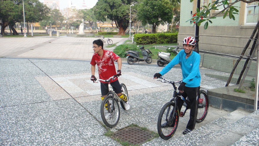 星期天高雄好天氣出太陽, 車友拿攀岩車彈吉他, 台北整天下雨車友在家裏拿吉他來騎.