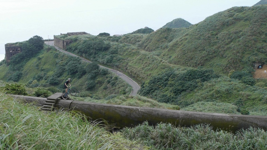 較值得一提的是,影片的開頭是位於九份的金瓜石附近所拍攝,那邊因為古時候的礦工業,留下了主要三條廢棄的排煙管延綿於山丘之中,雖然可以騎的路線不多,但風景實在是很壯觀,因此選做開頭影片用。