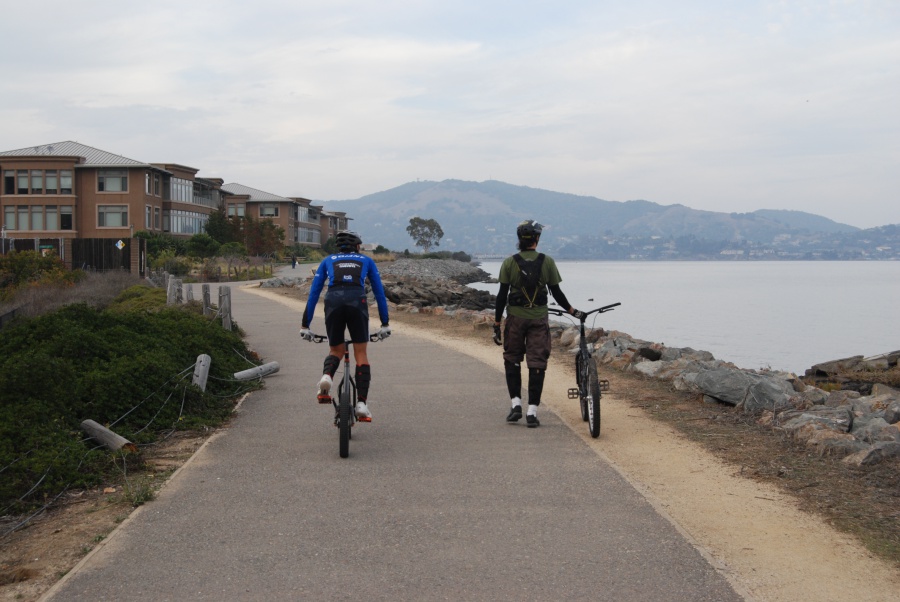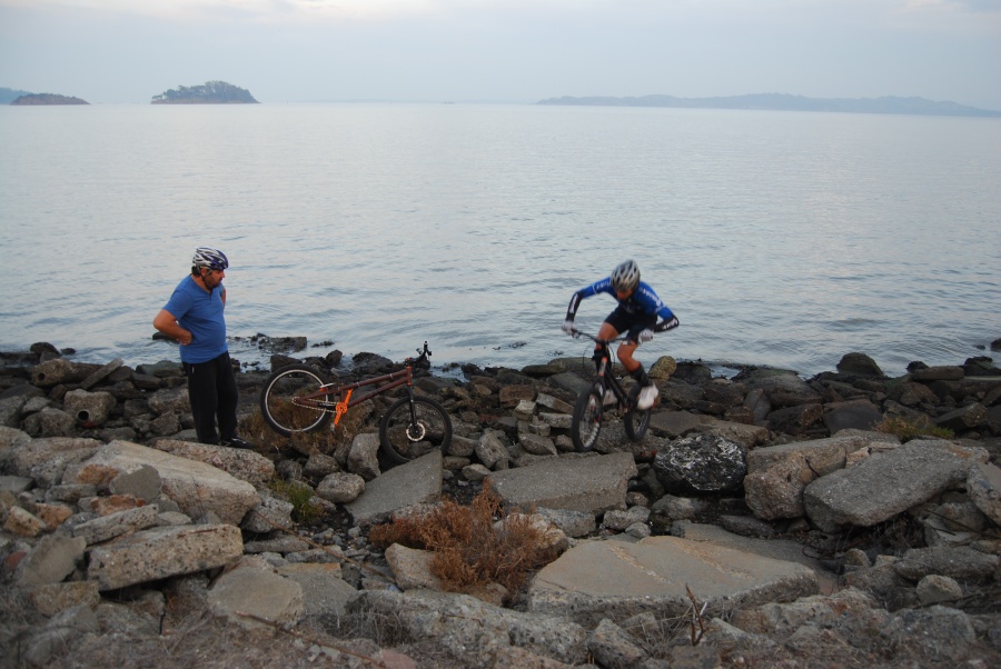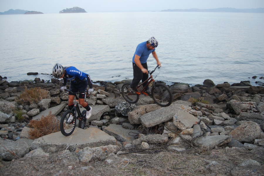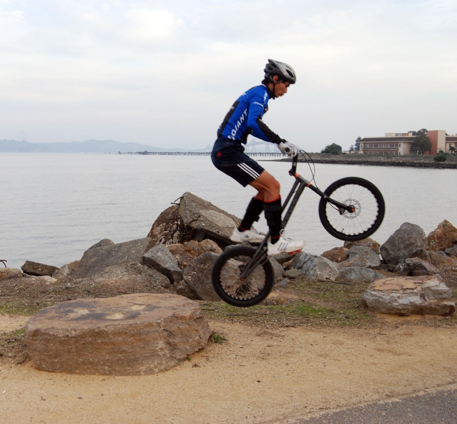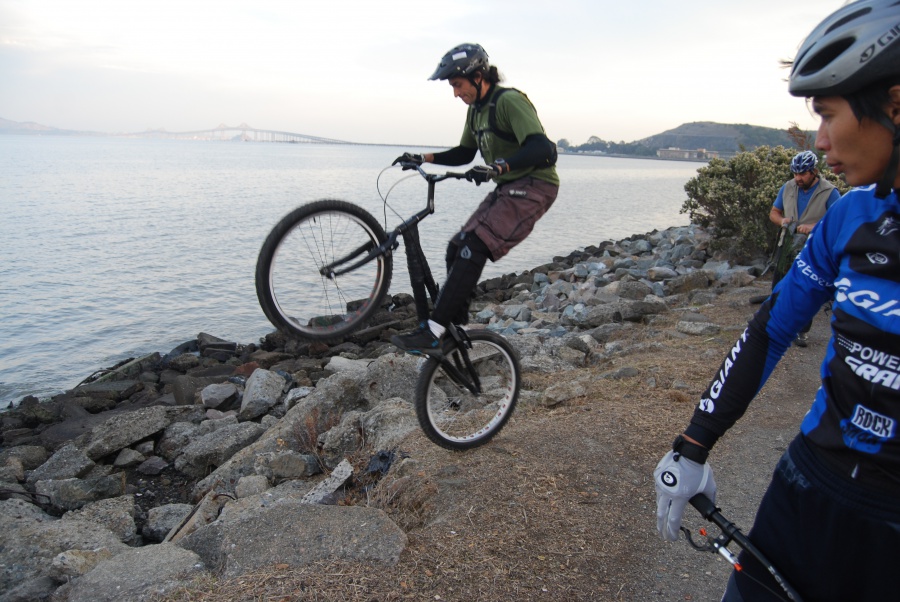前幾天很幸運的在Berkeley Marina 遇見了一位練攀岩車6年的前輩 Vincent。在他盛情邀約下第一次參予了San Francisco Bay area 的 Thanksgiving 團練。看著前輩們輕鬆自在的在岩石上飛上飛下,小弟(攀岩車齡2才,故稱小弟)所幸壯起膽來拼了。第一次跳下30cm落差,能平安落地,感謝上蒼保佑。(其後摔了好幾次,也掛彩了,不過在大家的鼓勵下,我其實也是摔的不亦樂乎。)今後終於要向更高的落差邁進了。
