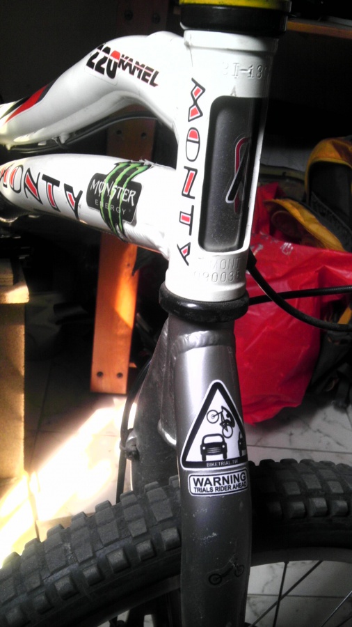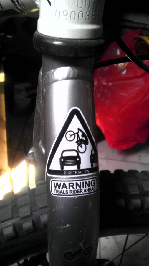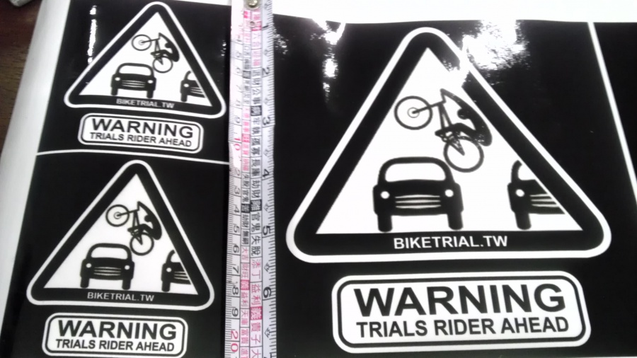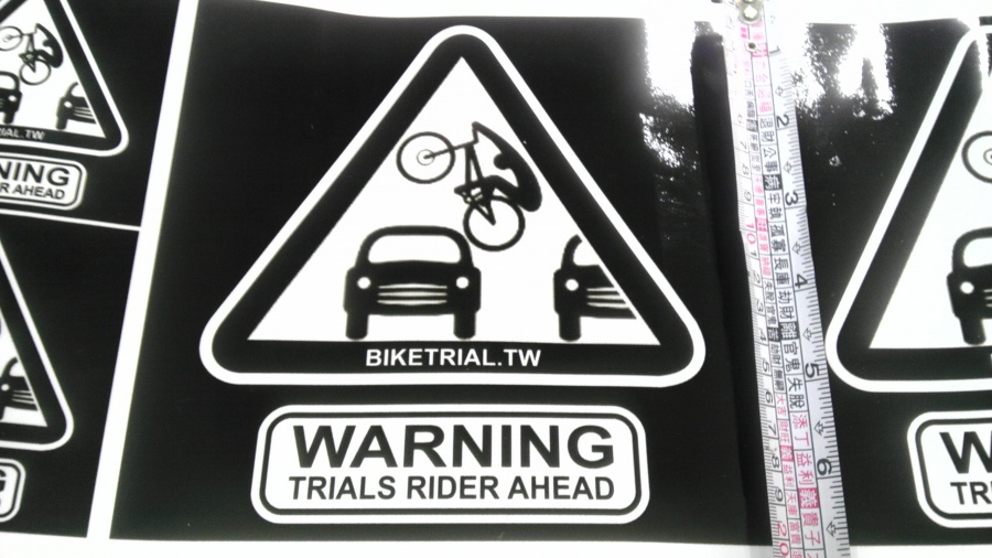 檔案給大家囉,並附上6*6cm實際貼在小攀前叉照,6*6CM越南這邊報價100張以上,每張10元台幣,好像還可以,不過BIKETRIAL.TW好像這樣看太小了,或許可以把WARNING下面那一行刪掉換BIKETRIAL.TW,或是下面整個換掉應該會更顯眼,看板主及各位前輩大大有什麼建議與指教。
