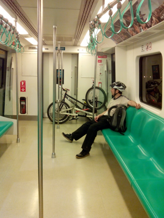 4. 到月台時直接走到底靠最前面牆邊的月台入口,地上會寫腳踏車入口,進車廂後腳踏車就放在門旁邊就好