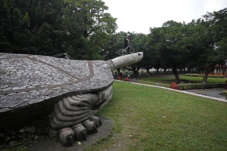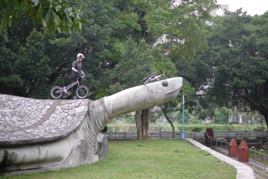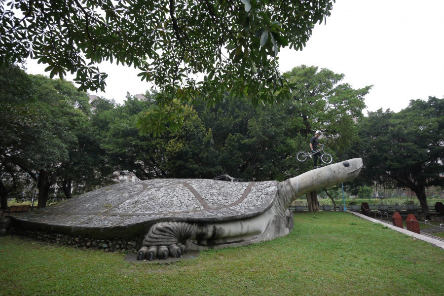 除了一隻我們都因天雨潮溼不敢跳的烏龜以外,這個公園沒太多東西可以騎