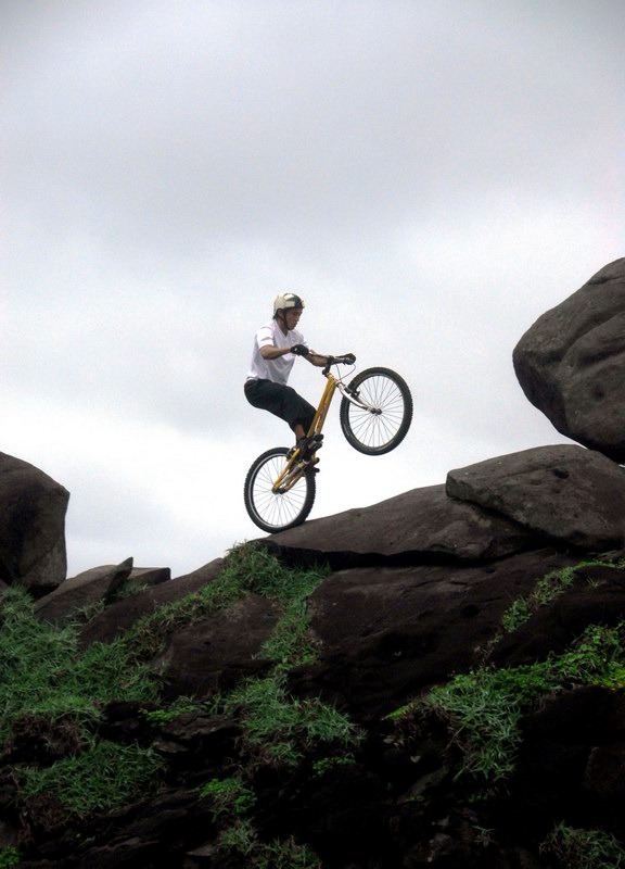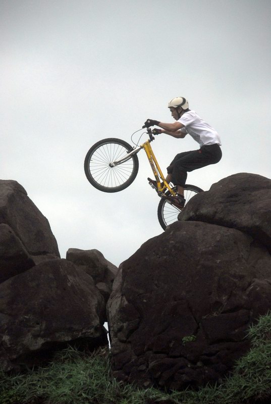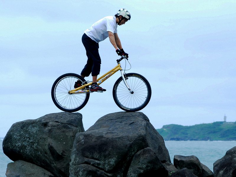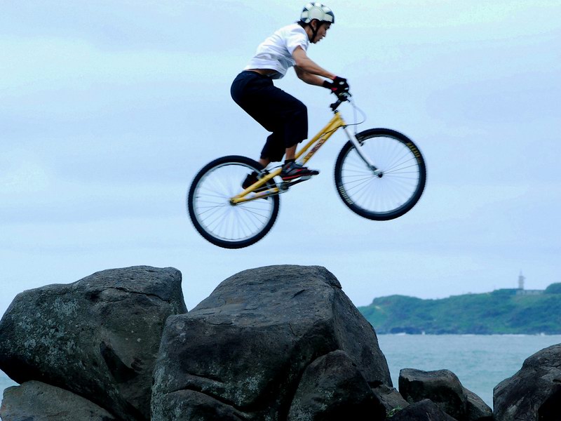 輪胎氣壓用好,跳前要蹲夠,抓準時機跳,跳的同時手配合施力,跳出後身體往前靠再推車子