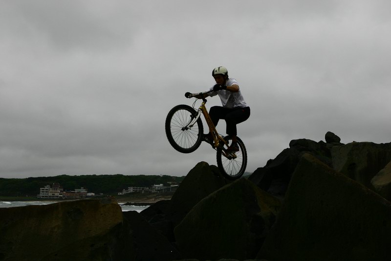 後來跳著跳著, 我發現前方有一斜面大塊石頭, 然後此時我正騎在一細長的石頭上, 想說可用點跳, 直接用直的方式往前跳上.