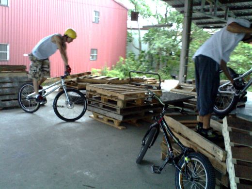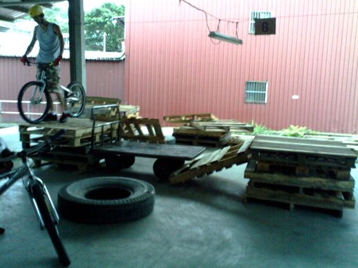 我們還把那邊的推車, 輪胎, 站板擺成一些很靈活的路段來騎, 不錯玩~XD!!!