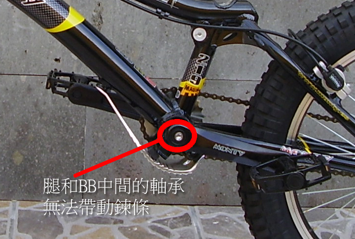 如果你的車就是圖中這一款MONTY 219 MAGURA 的話, 這一款是後飛輪式的構造, 你所標示的部分BB是自由轉動的機構, 而齒盤部分是一個固定的24齒, 這些都跟帶動鏈條沒有關係.