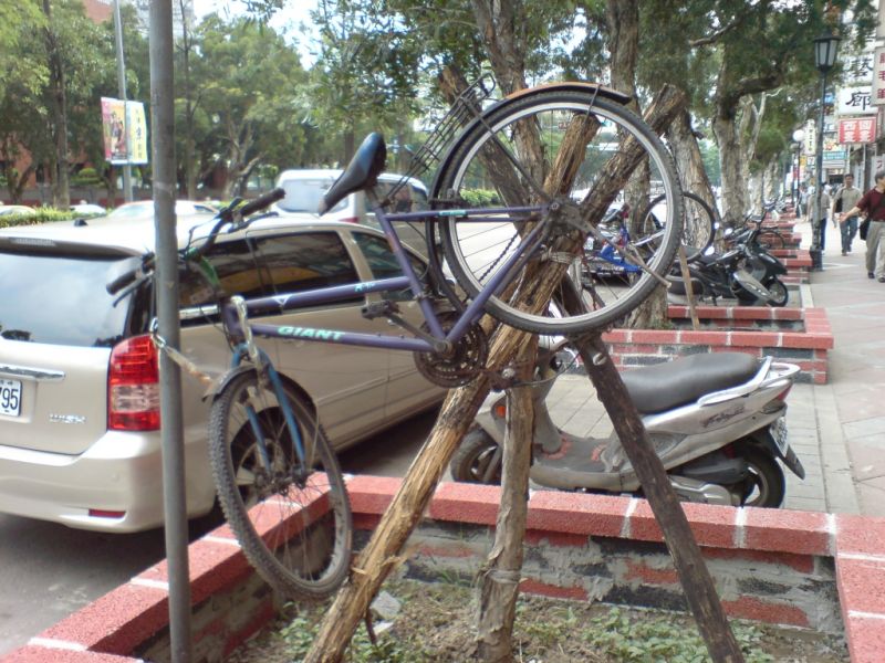 這是台北市政府的單車收費停車樹, 每顆樹停一次十元。